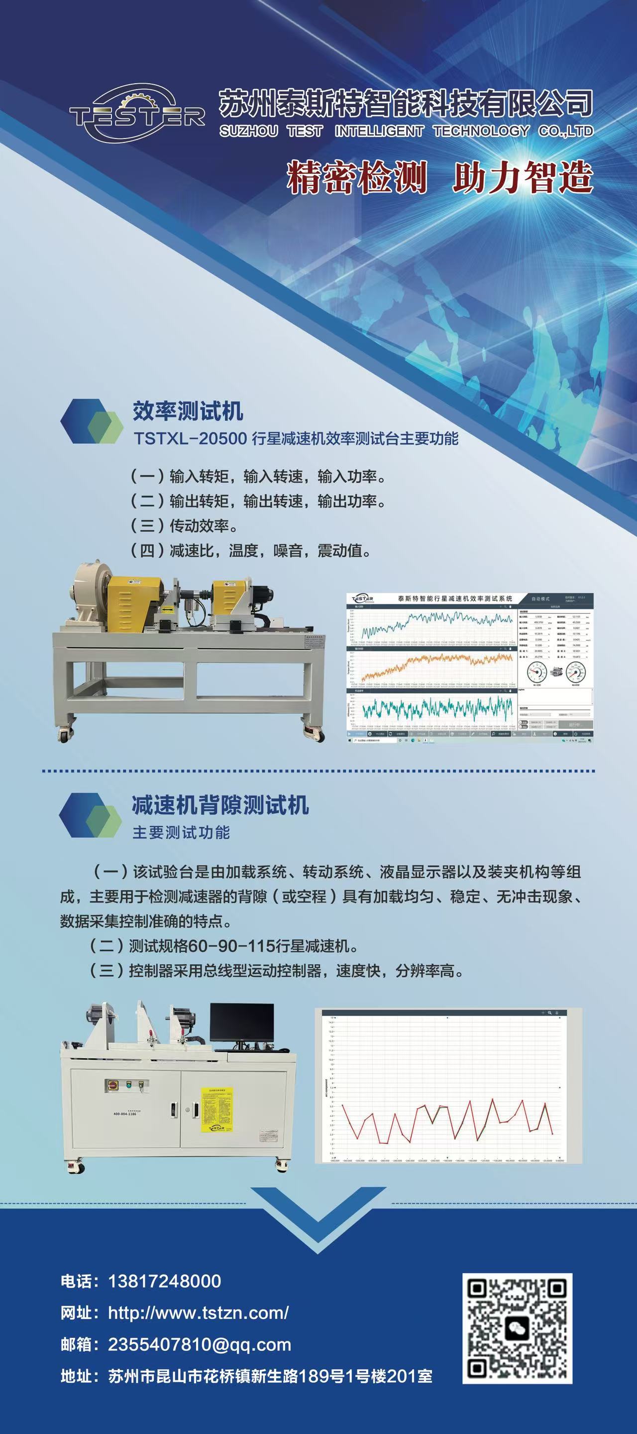 蘇州泰斯特智能科技有限公司以高、新、尖技術(shù)力量為核心,專注研發(fā)、生產(chǎn)、銷售精密行星減速機(jī)背隙測試機(jī),減速機(jī)測功機(jī),電機(jī)測功機(jī),伺服壓力機(jī),RV減速機(jī),諧波減速機(jī)角度傳遞誤差測試,啟動(dòng)力矩測試,背隙,剛性測試,回差測試,彈簧常數(shù),滯回曲線測試設(shè)備,排針機(jī)相關(guān)自動(dòng)化設(shè)備的廠家, 本著“專注、只為更好”為核心理念,通過先進(jìn)的管理手段,將技術(shù)、品質(zhì)工藝改進(jìn),有效的融為一體,為客戶提供精密、穩(wěn)定、快捷的減速機(jī)檢測產(chǎn)品及方案。